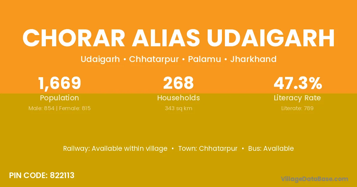 Chorar Alias Udaigarh village has a total population of 1,669 people, of which 854 are males and 815 are females.