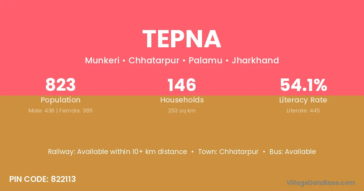 Tepna village has a total population of 823 people, of which 438 are males and 385 are females.