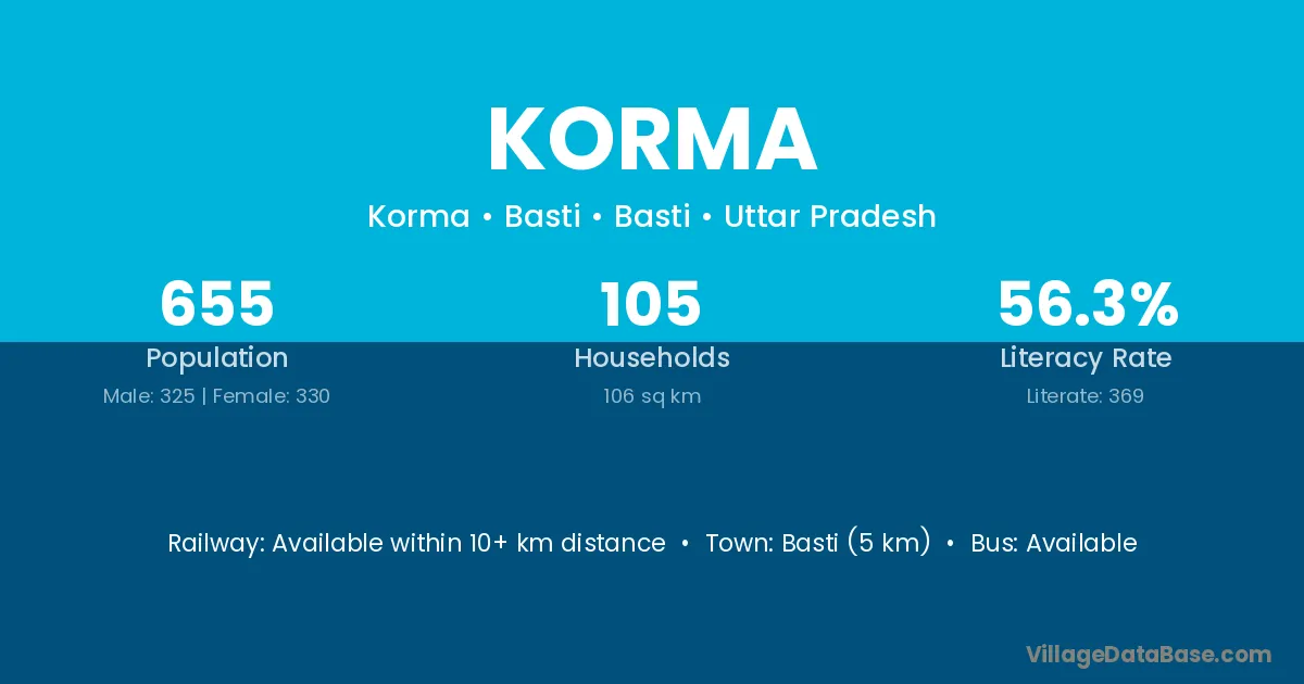 The literacy rate of Korma village is 64.77%. Male literacy stands at 77.78% and female literacy at 44.12%.
