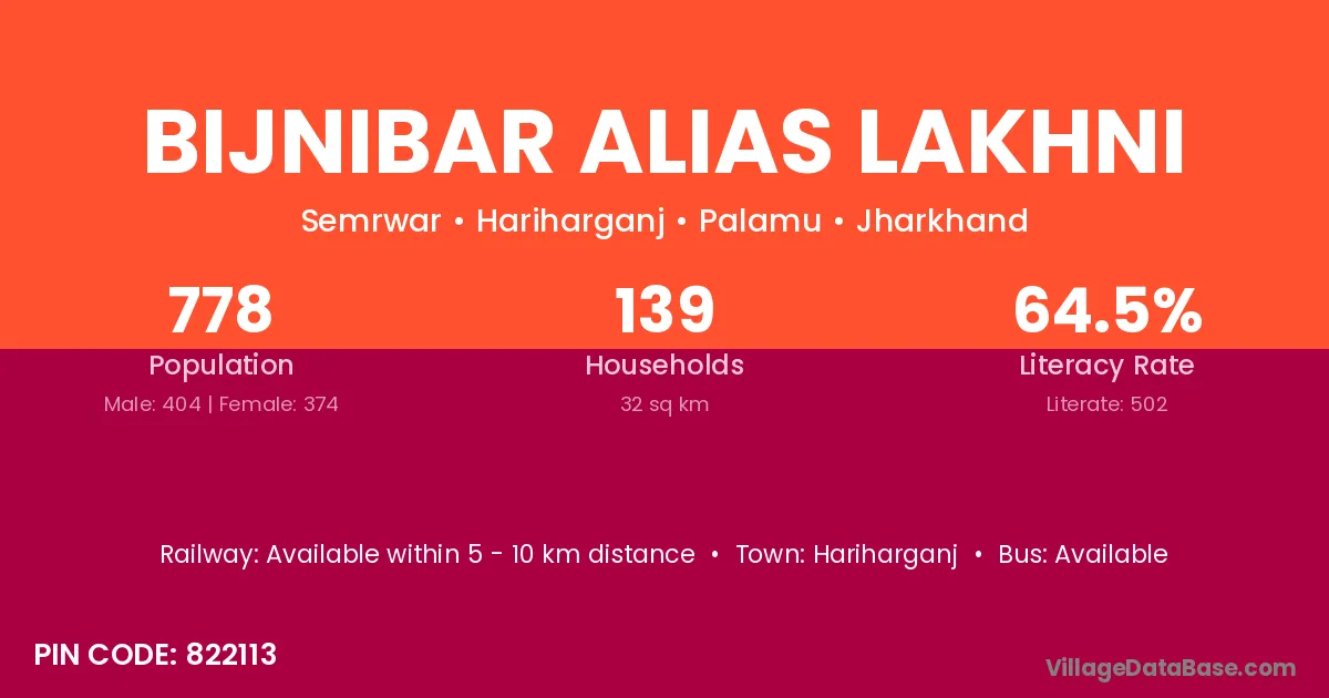 Bijnibar Alias Lakhni village has a total population of 778 people, of which 404 are males and 374 are females.