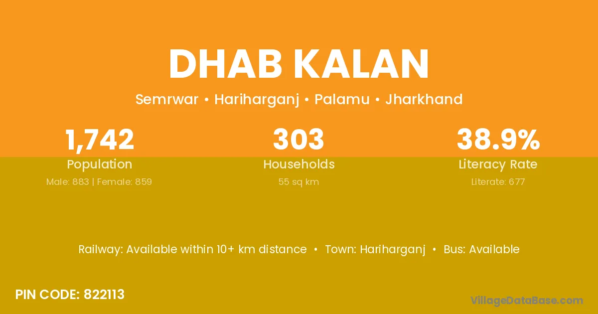 Dhab Kalan village has a total population of 1,742 people, of which 883 are males and 859 are females.