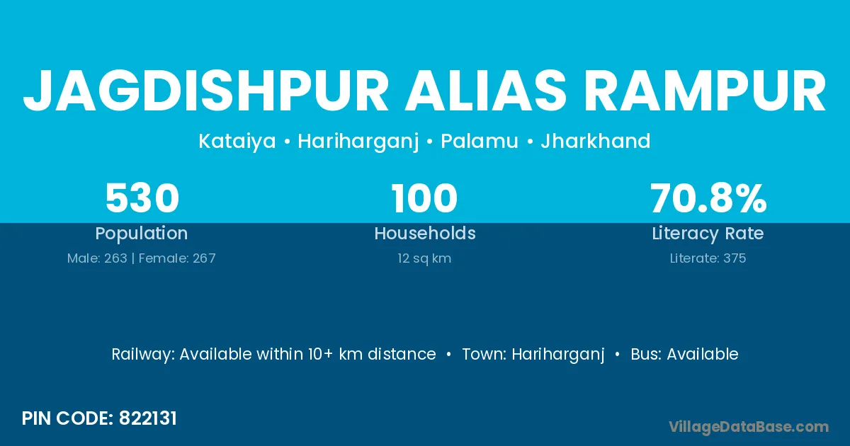 Jagdishpur Alias Rampur village has a total population of 530 people, of which 263 are males and 267 are females.