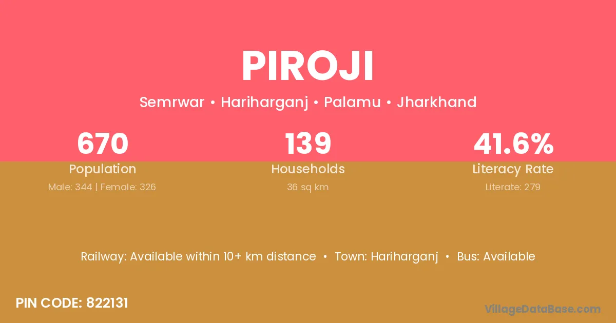 Piroji village has a total population of 670 people, of which 344 are males and 326 are females.