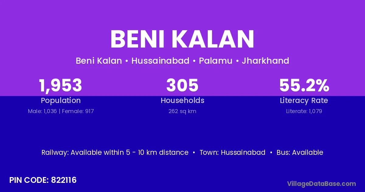 Beni Kalan village is located in the Hussainabad Subdivision of the Palamu district in Jharkhand .