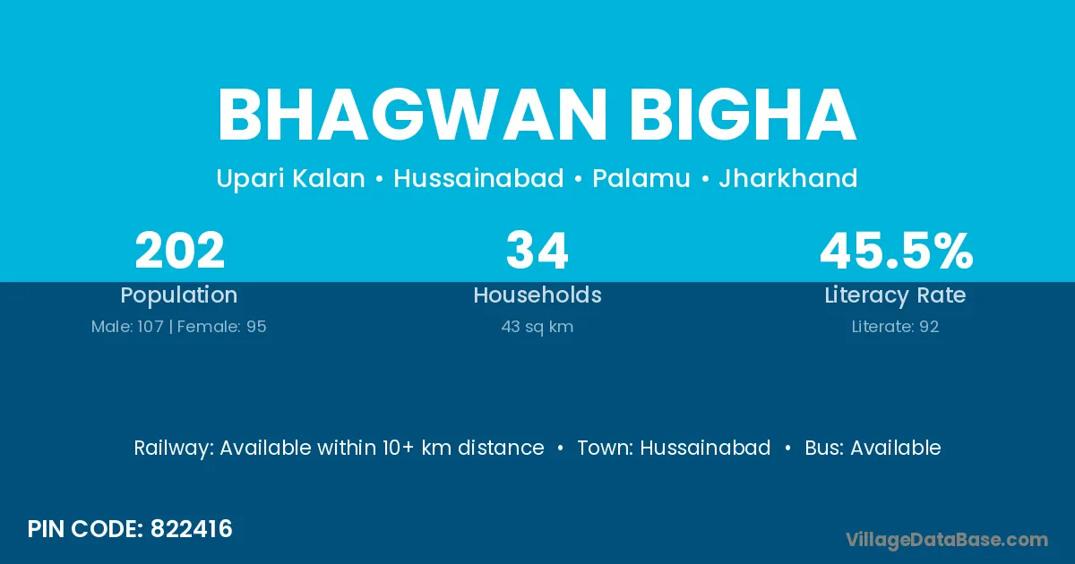 Bhagwan Bigha village has a total population of 202 people, of which 107 are males and 95 are females.