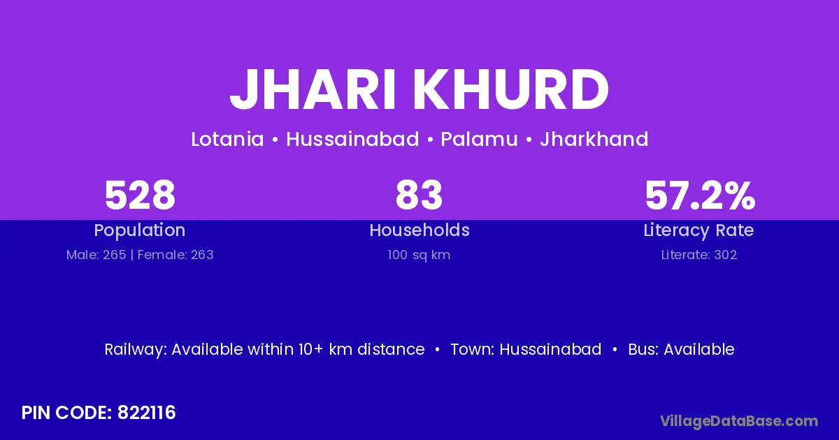 Jhari Khurd village has a total population of 528 people, of which 265 are males and 263 are females.