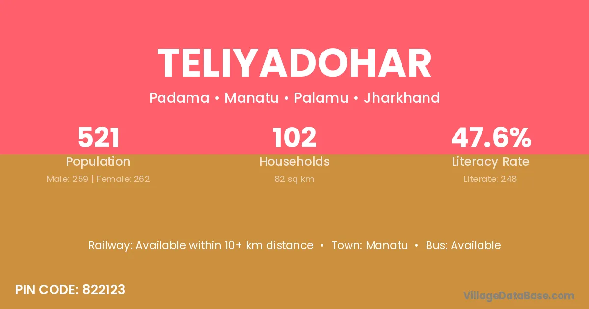 Teliyadohar village is located in the Manatu Subdivision of the Palamu district in Jharkhand .