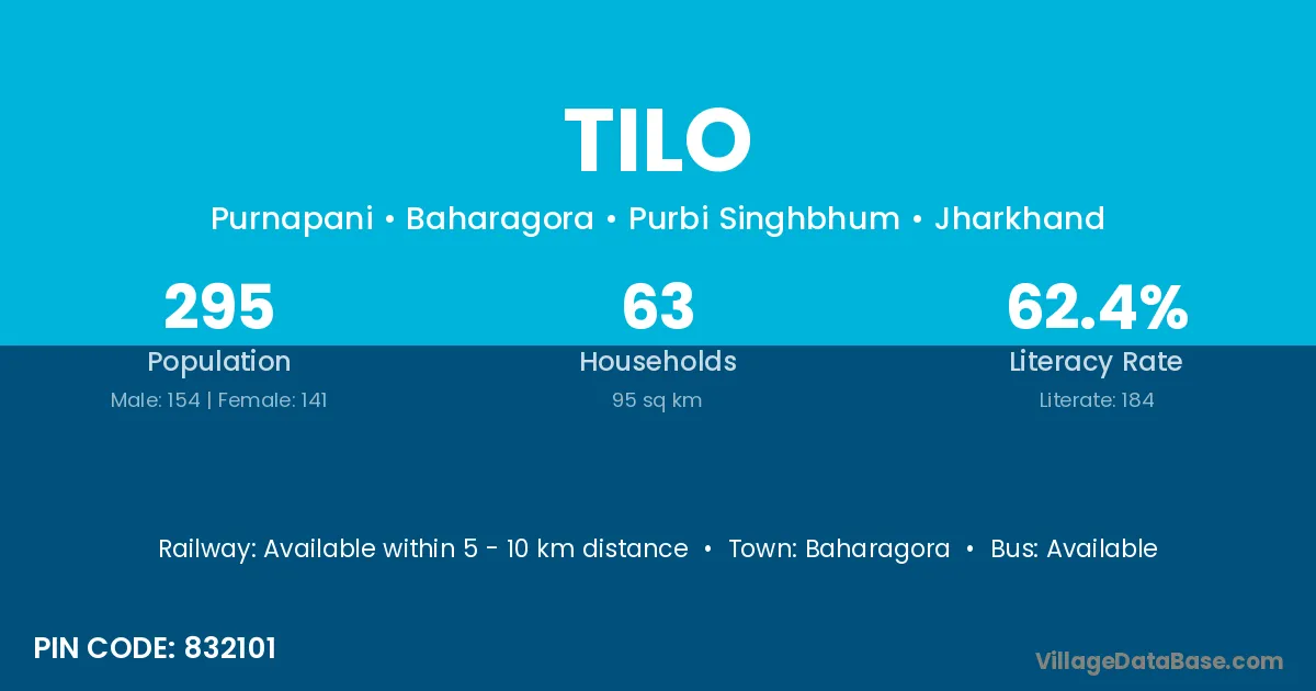 The literacy rate of Tilo village is 45.14%. Male literacy stands at 55.60% and female literacy at 34.51%.