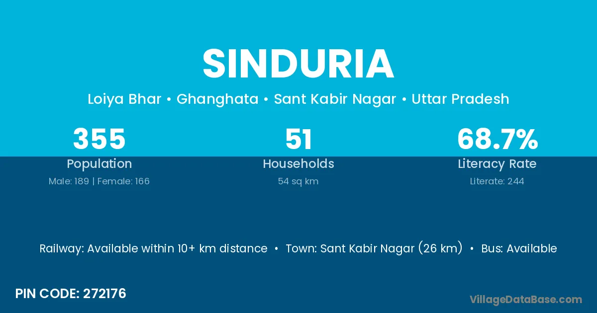 The literacy rate of Sinduria village is 53.62%. Male literacy stands at 64.92% and female literacy at 42.13%.