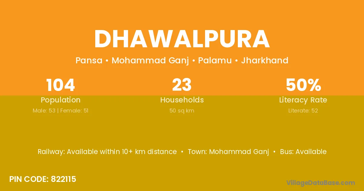 Dhawalpura village has a total population of 104 people, of which 53 are males and 51 are females.