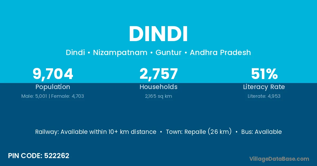 The literacy rate of Dindi village is 84.21%. Male literacy stands at 88.89% and female literacy at 80.00%.