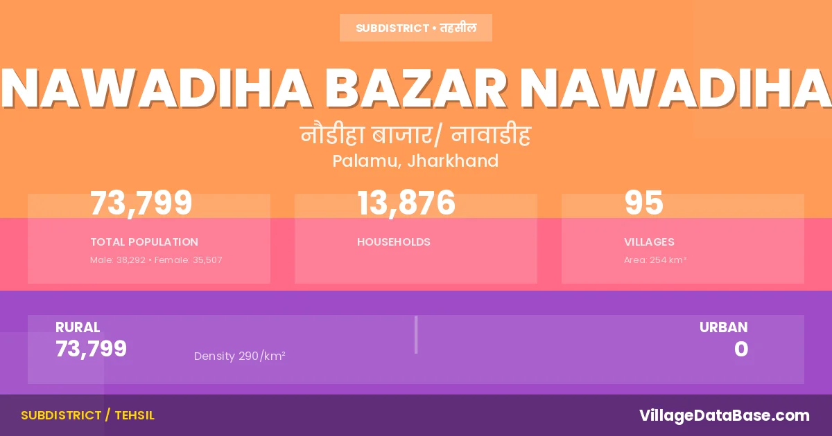 Nawadiha Bazar Nawadiha is a town and Subdivision in the Palamu district of the Jharkhand. In India, a Subdivision is a subdivision of a district responsible for the administration and revenue collection of a specific area within the district. Subdivisions play a crucial role in the local governance structure, contributing significantly to the development and administration of their communities.