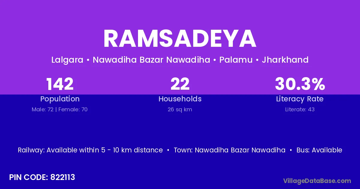 Ramsadeya village has a total population of 142 people, of which 72 are males and 70 are females.