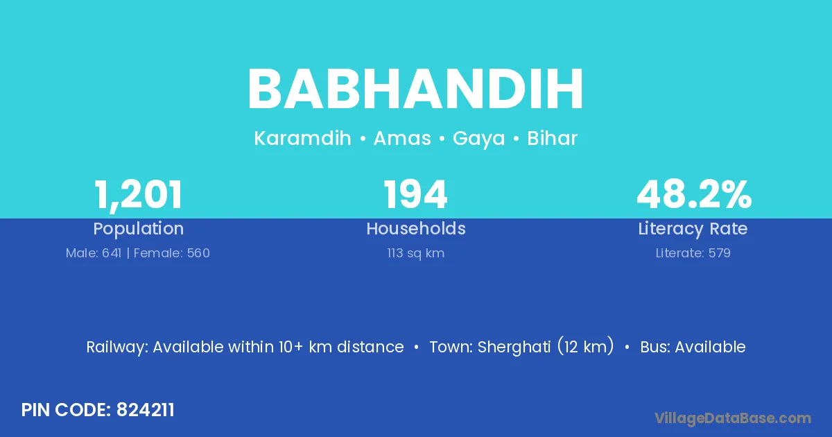 The literacy rate of Babhandih village is 63.64%. Male literacy stands at 75.00% and female literacy at 50.00%.