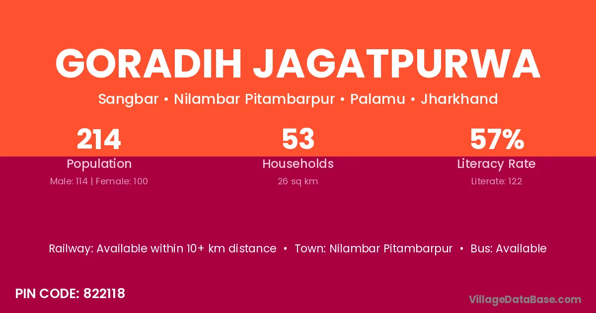 Goradih Jagatpurwa village has a total population of 214 people, of which 114 are males and 100 are females.