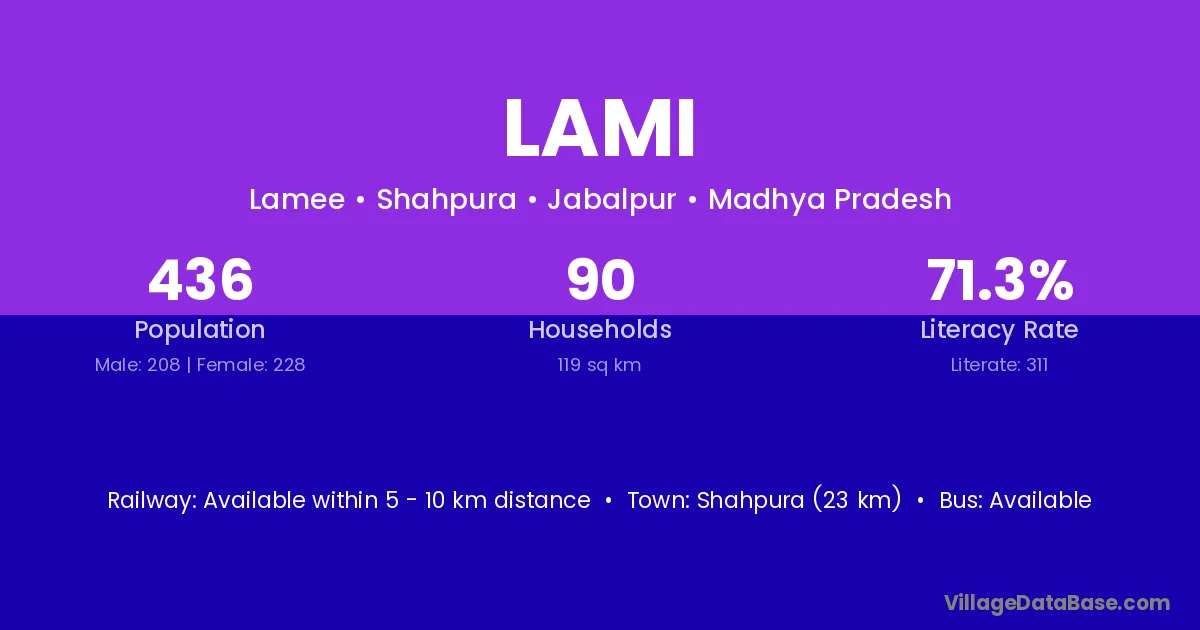 The literacy rate of Lami village is 53.37%. Male literacy stands at 63.70% and female literacy at 42.71%.