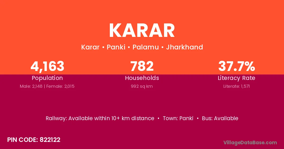 Karar village has a total population of 4,163 people, of which 2,148 are males and 2,015 are females.