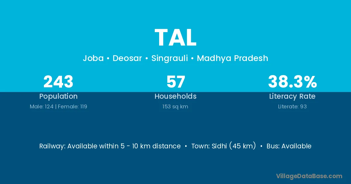 The literacy rate of Tal village is 45.31%. Male literacy stands at 54.20% and female literacy at 35.65%.