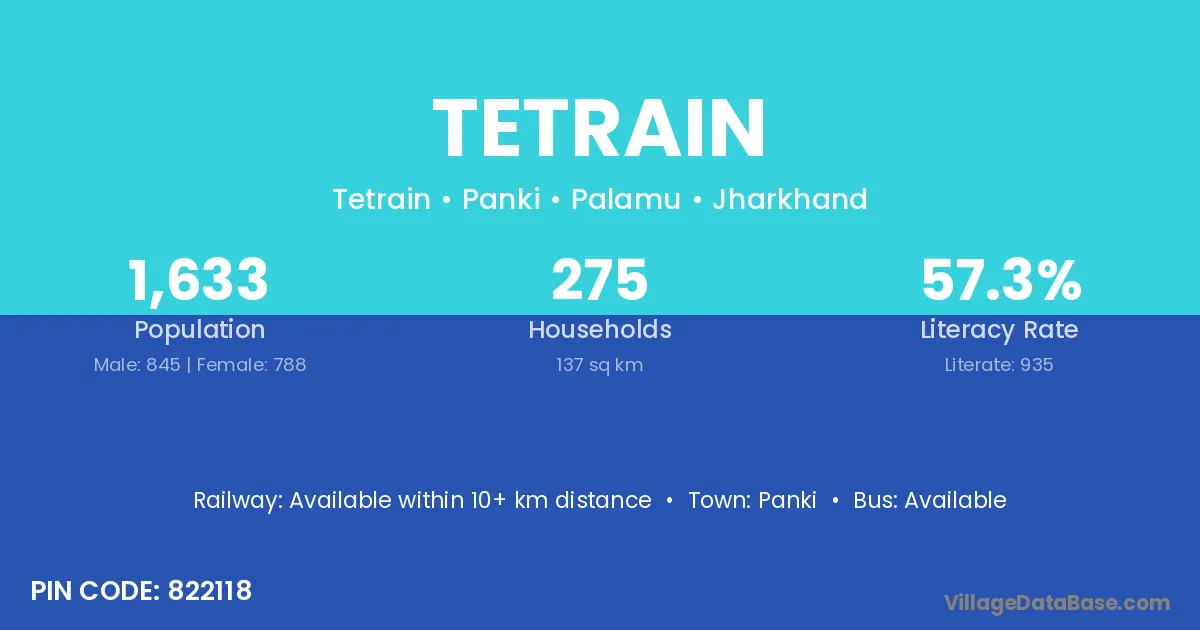 Tetrain village has a total population of 1,633 people, of which 845 are males and 788 are females.