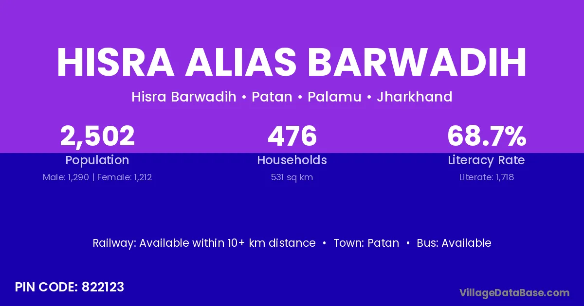 Hisra Alias Barwadih village has a total population of 2,502 people, of which 1,290 are males and 1,212 are females.