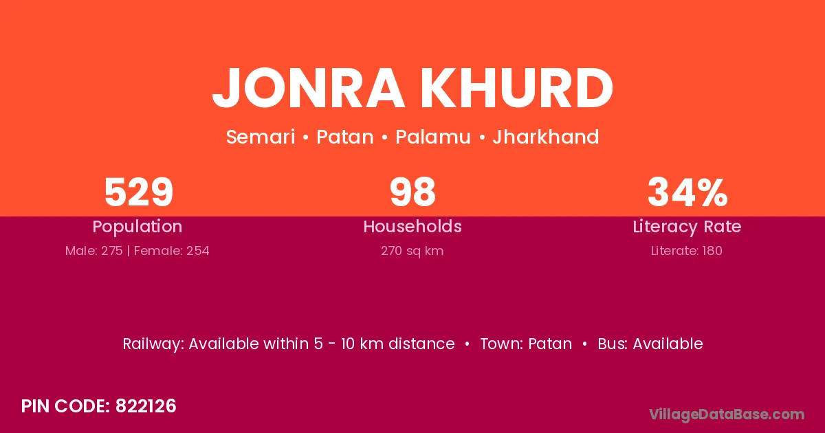 Jonra Khurd village has a total population of 529 people, of which 275 are males and 254 are females.