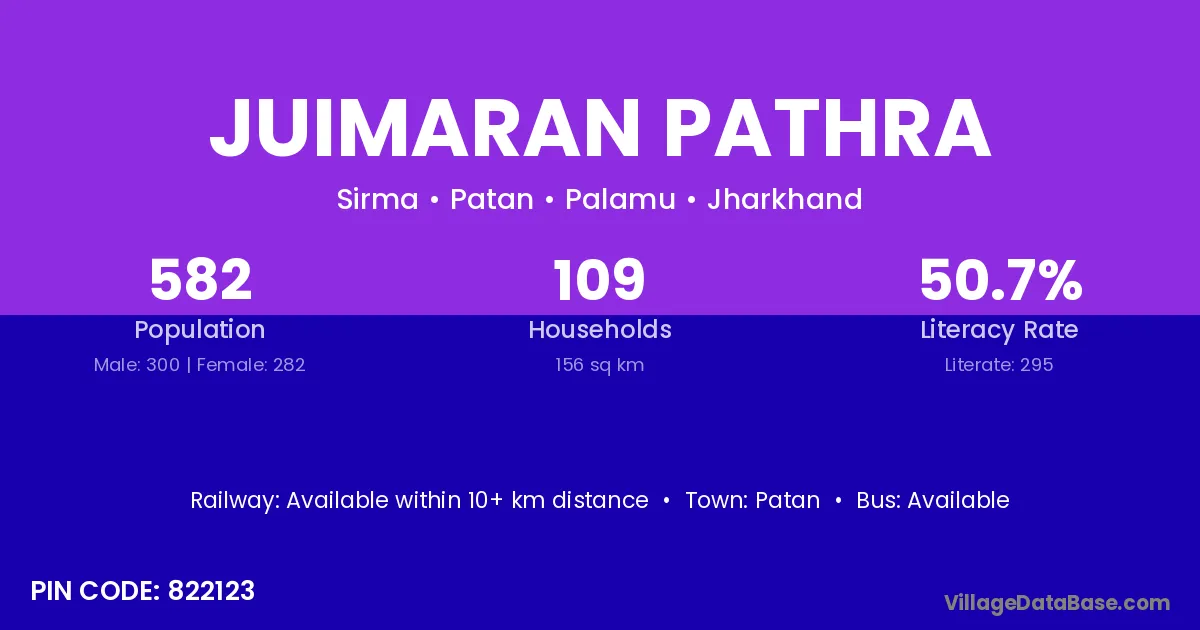 Juimaran Pathra village has a total population of 582 people, of which 300 are males and 282 are females.
