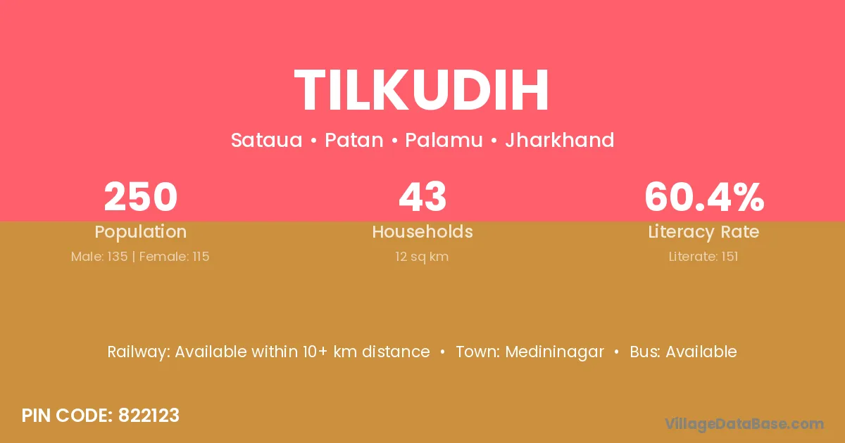 The literacy rate of Tilkudih village is 60.40%. Male literacy stands at 67.41% and female literacy at 52.17%.