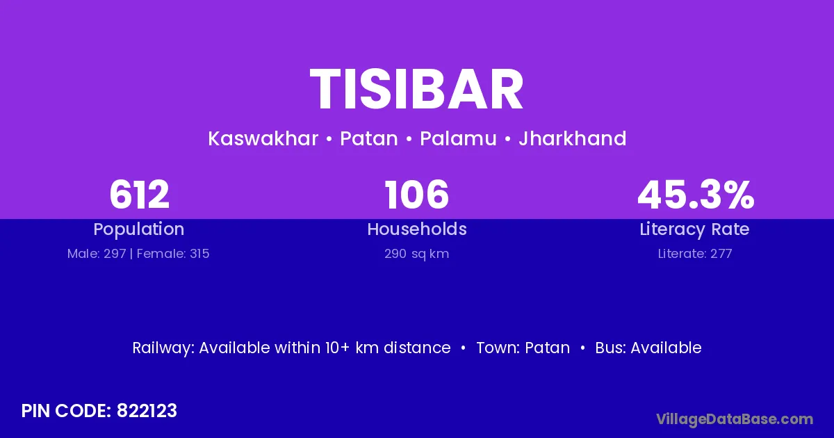 The literacy rate of Tisibar village is 45.26%. Male literacy stands at 56.90% and female literacy at 34.29%.
