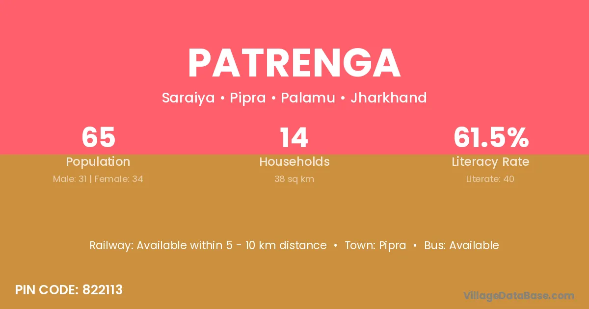 Patrenga village has a total population of 65 people, of which 31 are males and 34 are females.