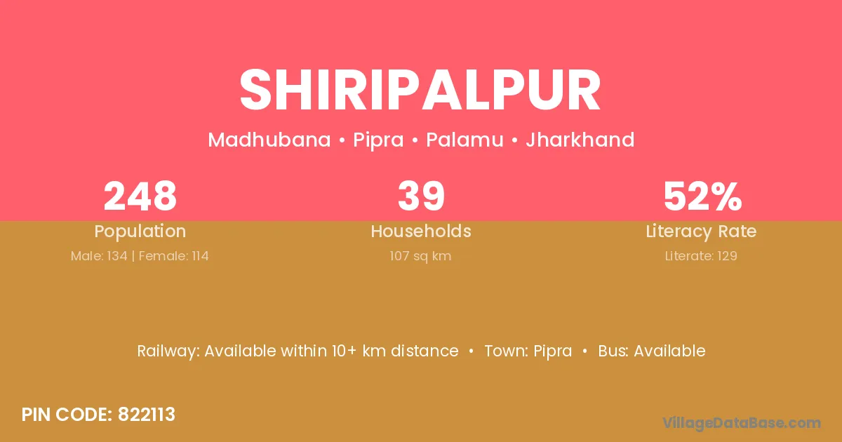 Shiripalpur village has a total population of 248 people, of which 134 are males and 114 are females.