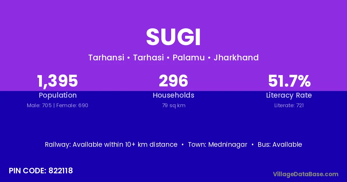 Sugi village is located in the Tarhasi Subdivision of the Palamu district in Jharkhand .
