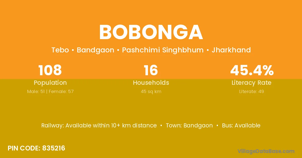 Bobonga village has a total population of 108 people, of which 51 are males and 57 are females.
