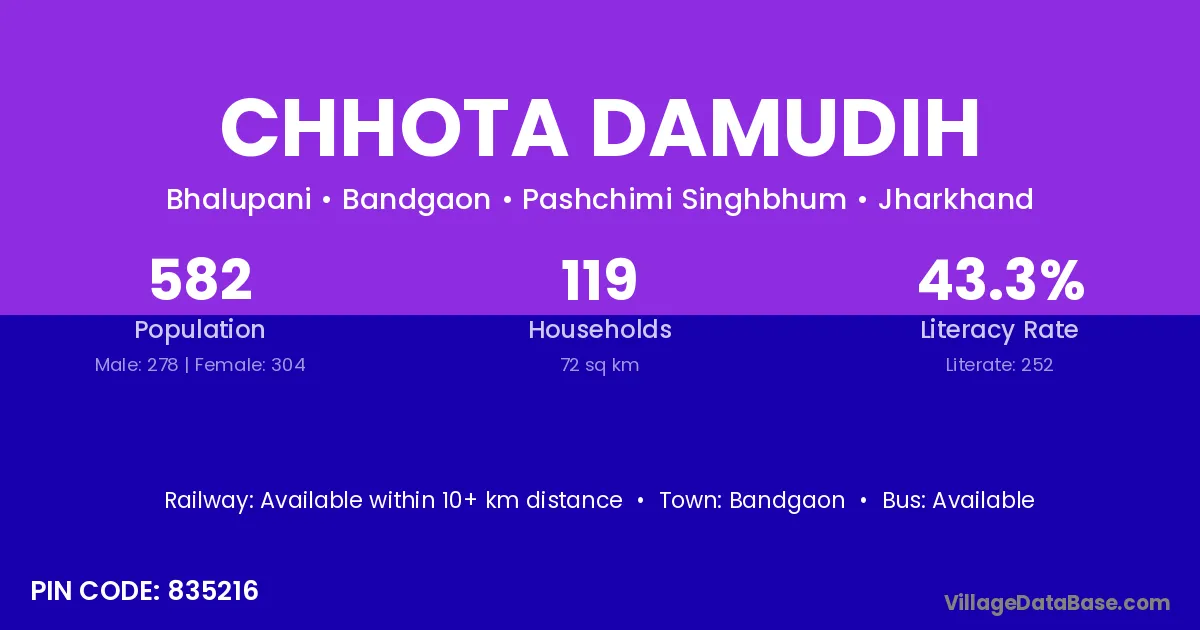 Chhota Damudih village has a total population of 582 people, of which 278 are males and 304 are females.