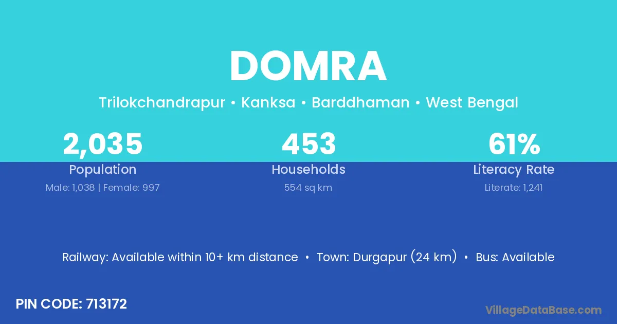 The literacy rate of Domra village is 39.27%. Male literacy stands at 53.12% and female literacy at 25.78%.