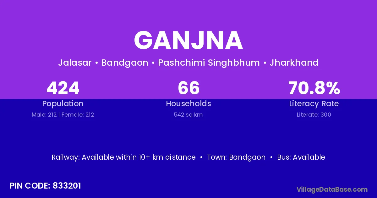 Ganjna village has a total population of 424 people, of which 212 are males and 212 are females.