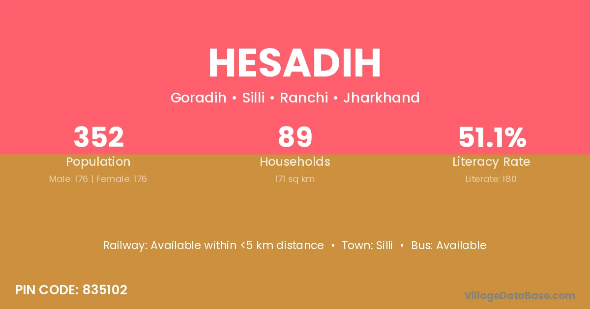 The literacy rate of Hesadih village is 49.70%. Male literacy stands at 69.63% and female literacy at 22.30%.