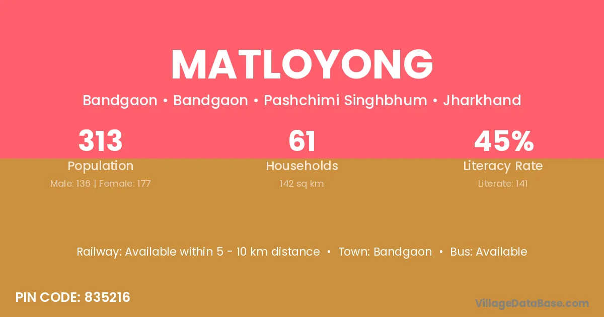 The literacy rate of Matloyong village is 45.05%. Male literacy stands at 58.09% and female literacy at 35.03%.
