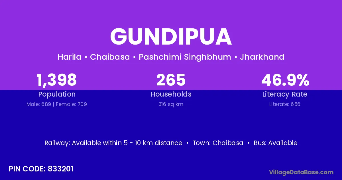Chaibasa is the nearest town to Gundipua village for major economic activities