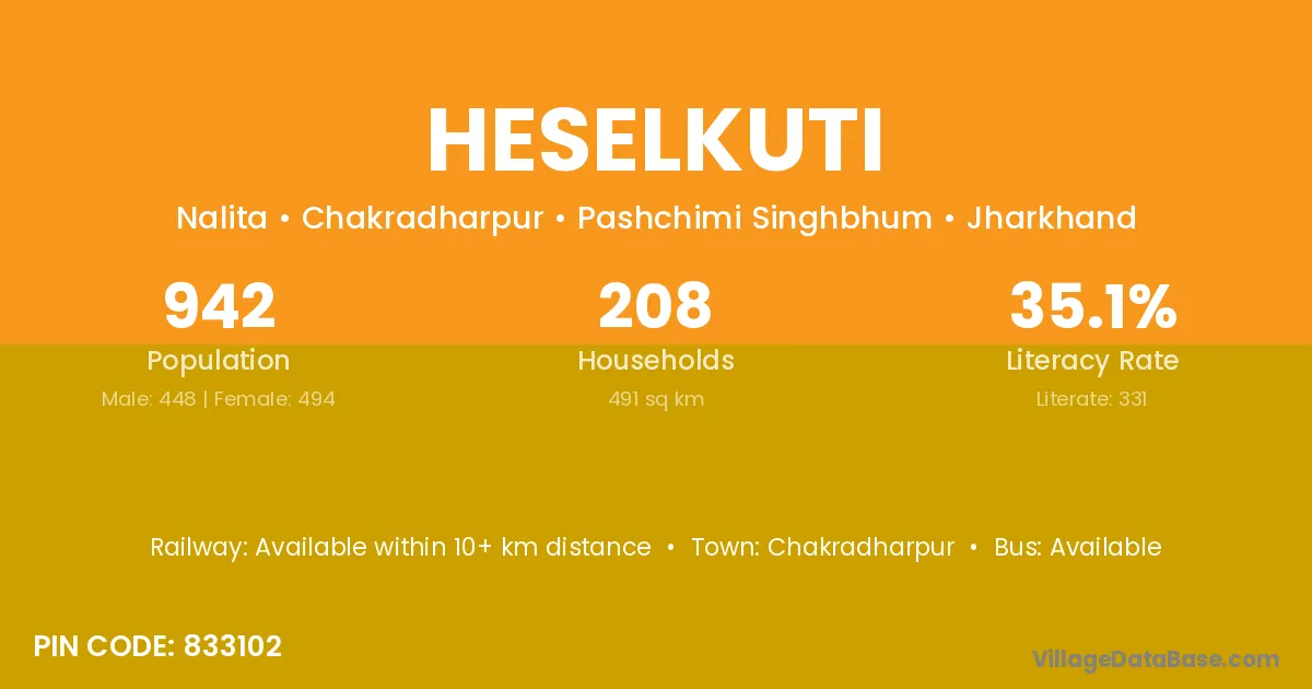 Heselkuti village has a total population of 942 people, of which 448 are males and 494 are females.