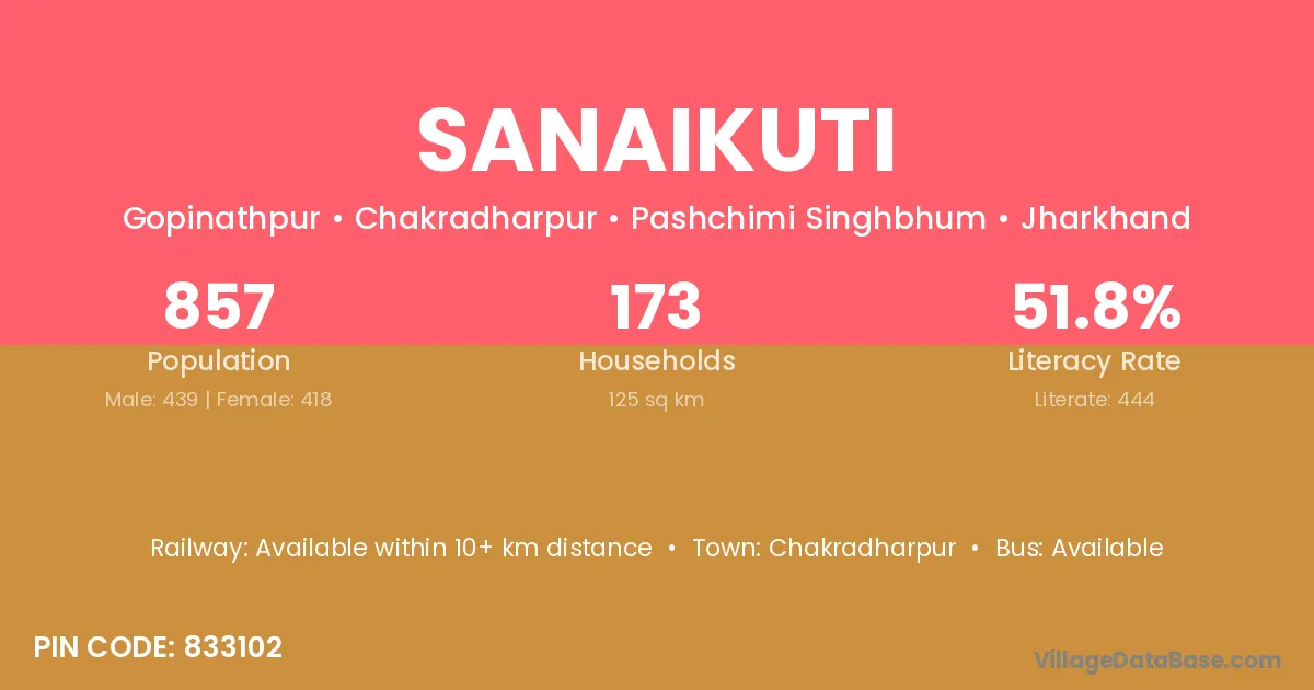 Sanaikuti village has a total population of 857 people, of which 439 are males and 418 are females.