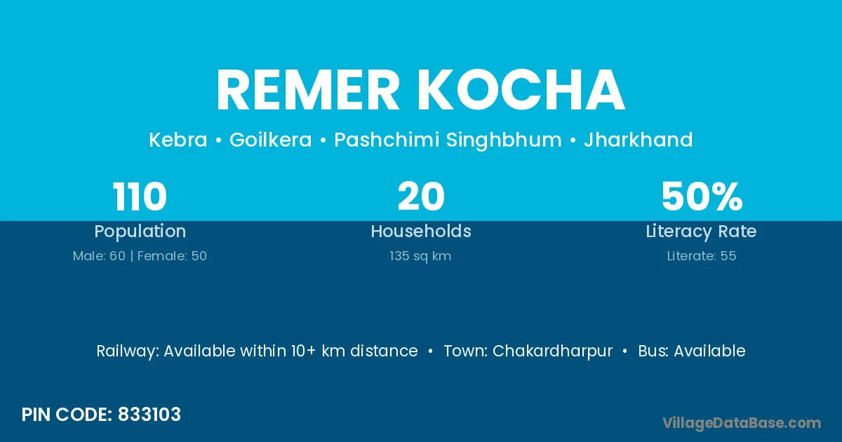 Remer Kocha village has a total population of 110 people, of which 60 are males and 50 are females.