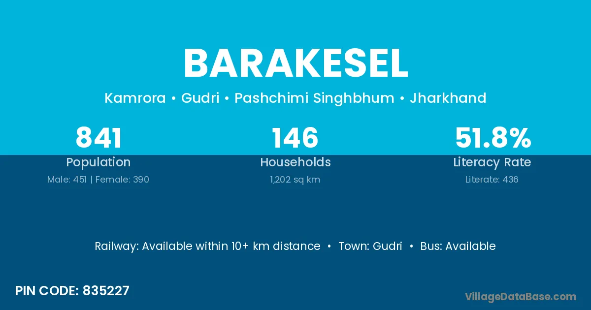 Barakesel village has a total population of 841 people, of which 451 are males and 390 are females.