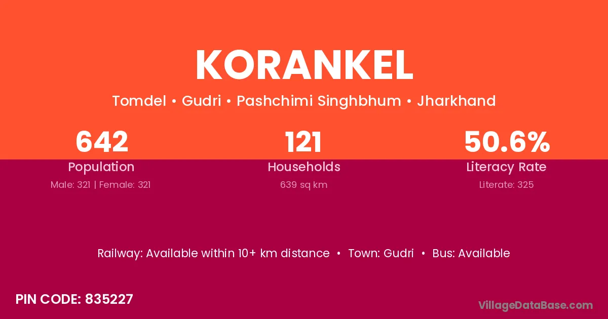 Korankel village has a total population of 642 people, of which 321 are males and 321 are females.