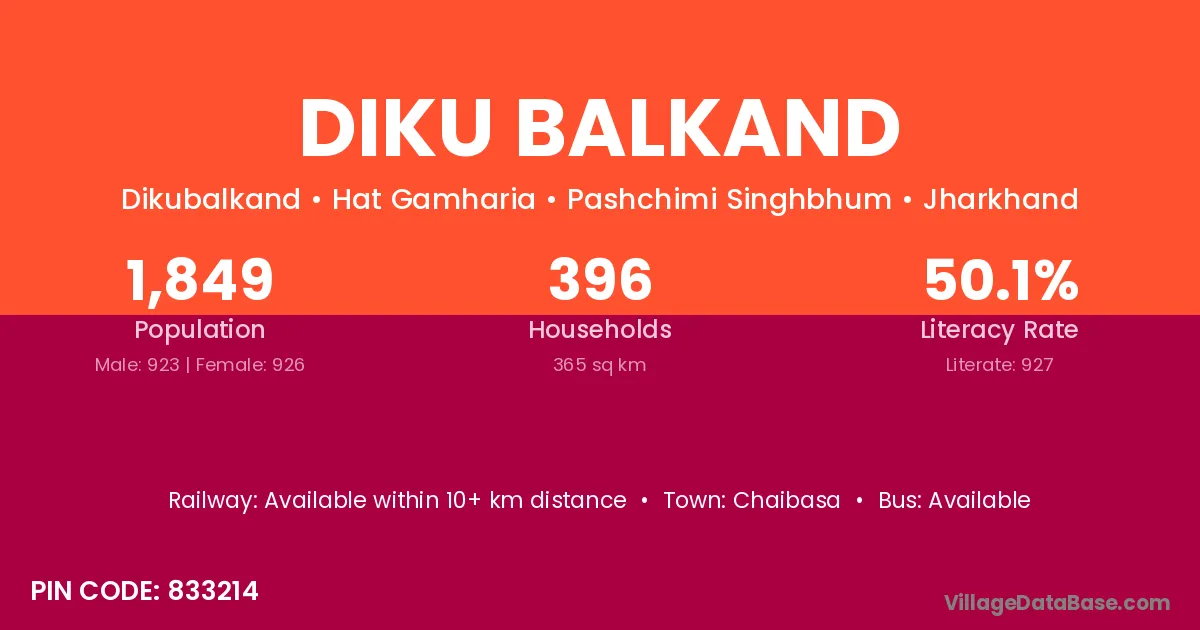 Diku Balkand village has a total population of 1,849 people, of which 923 are males and 926 are females.