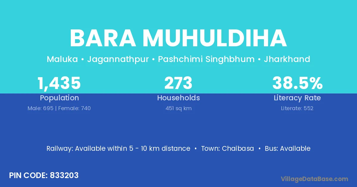 Chaibasa is the nearest town to Bara Muhuldiha village for major economic activities