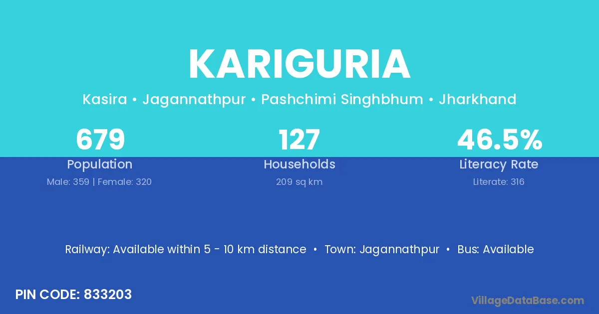 The literacy rate of Kariguria village is 46.54%. Male literacy stands at 59.61% and female literacy at 31.88%.