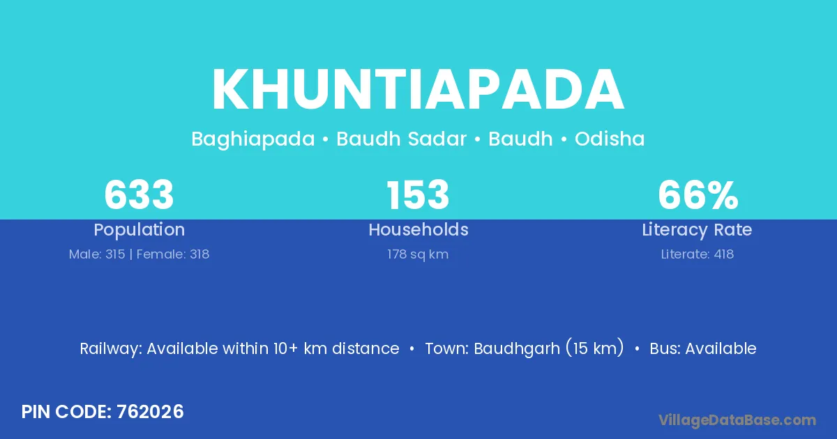Khuntiapada village has a total population of 1,234 people, of which 625 are males and 609 are females.