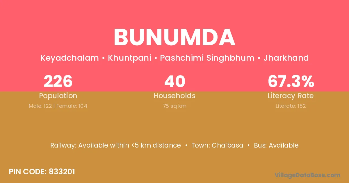 According to Census 2011 information, the village code of Bunumda village is 833201.