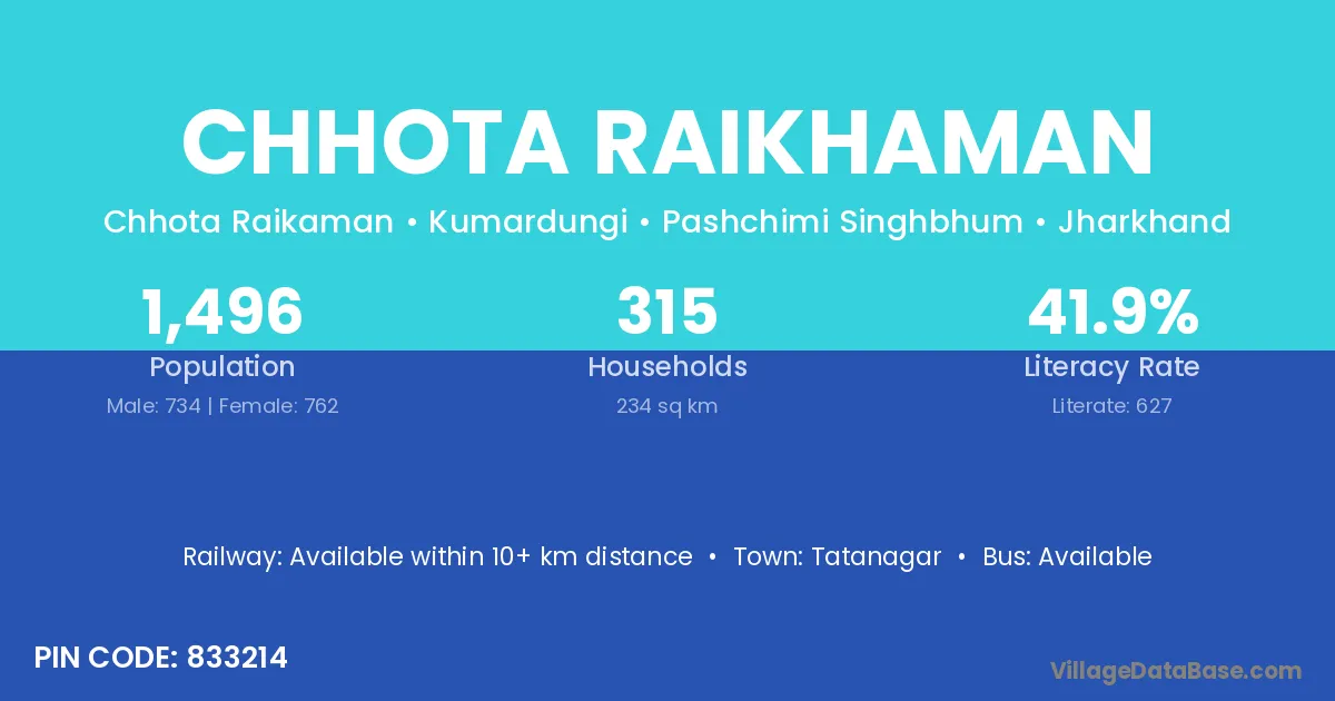 Chhota Raikhaman village has a total population of 1,496 people, of which 734 are males and 762 are females.