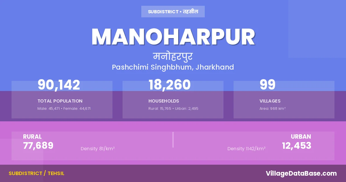 According to the 2011 census The total area of Manoharpur Subdivision is 968 km², with a population of 90142 people. The population density is 93 inhabitants per square kilometre, and there are approximately 18260 houses in the sub district.